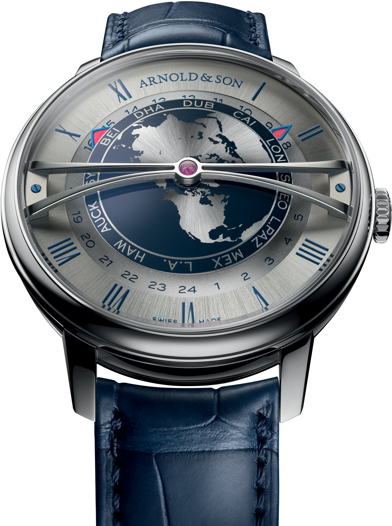 Like all calibres signed by Arnold & Son, Globetrotter’s movement has been conceived, developed, manufactured, decorated, assembled, regulated and encased entirely within the brand’s Manufacture in La Chaux-de-Fonds – a testament to the Maison’s uncompromising independence and mastery of fine watchmaking. Revealed through the sapphire crystal case back, the self-winding movement displays an openworked oscillating weight, finely engraved and meticulously finished. Traditional haute horlogerie decorations adorn every component: a circular-grained main plate, radiating Côtes de Genève on the bridges, satin-brushed wheels, and chamfered, polished screws. Its refined treatment imparts a luminous sheen, harmoniously echoing the steel cases it powers.