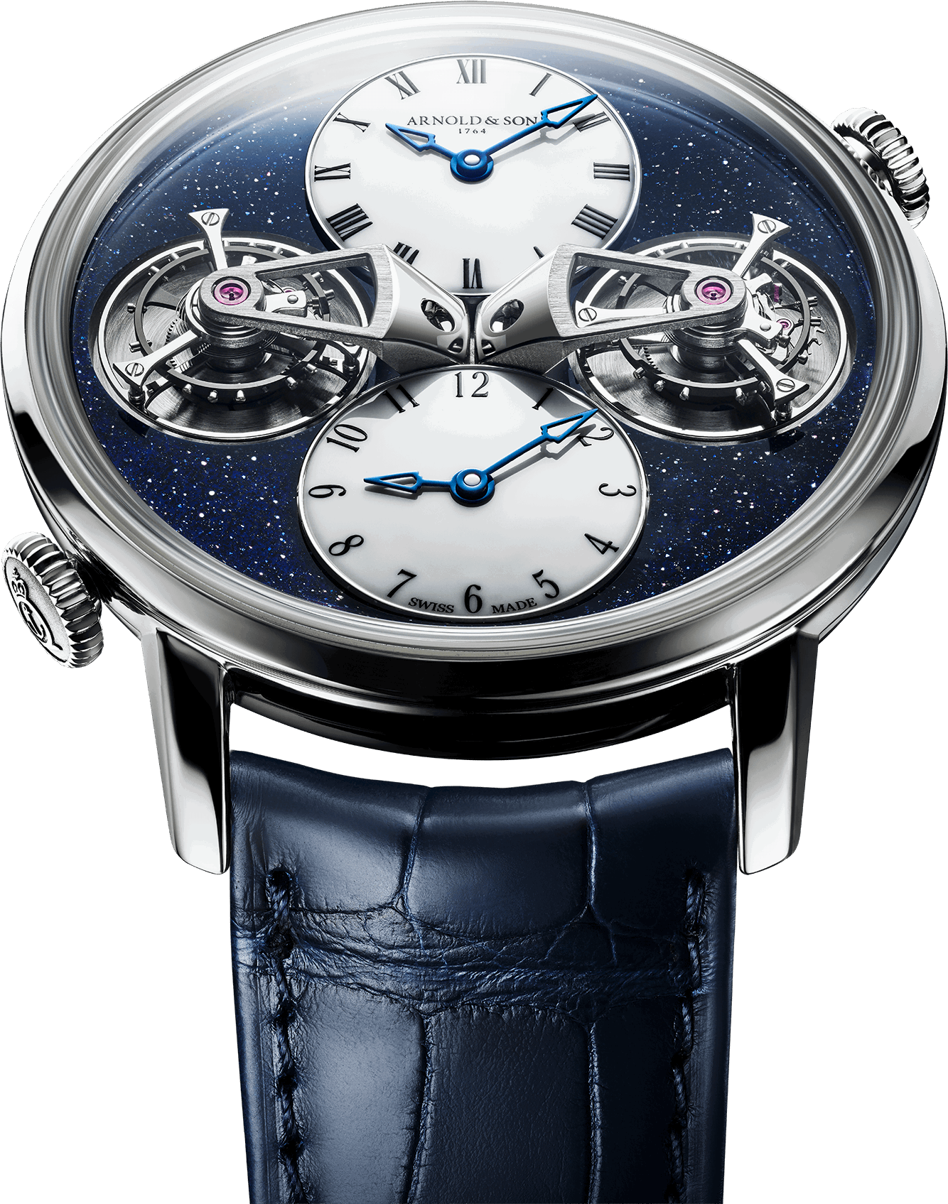 In watchmaking language, the tourbillon is a rare construction, and this is even more true of the double tourbillon. Its creation, the choice of its materials and above all its structural approach meet objectives that are at once aesthetic, historical and horological. Double Tourbillon White Gold sits at the crossroads of a number of major paths that Arnold & Son follows consistently and coherently.
