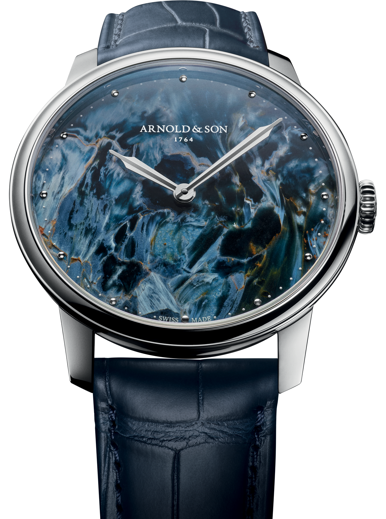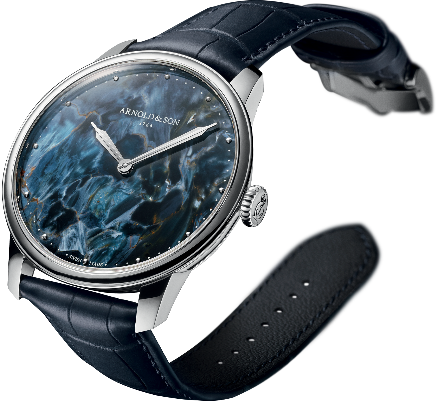 This decorative mineral, sometimes called the ‘stone of storms’, is a variety of chalcedony. It was discovered by Sid Pieters in Namibia at the beginning of the 1960s. It was selected by Arnold & Son for its delicate, swirling, random patterns that recall the skies of Cornwall during rough weather and the foaming waves that lash the rugged coasts of the county.