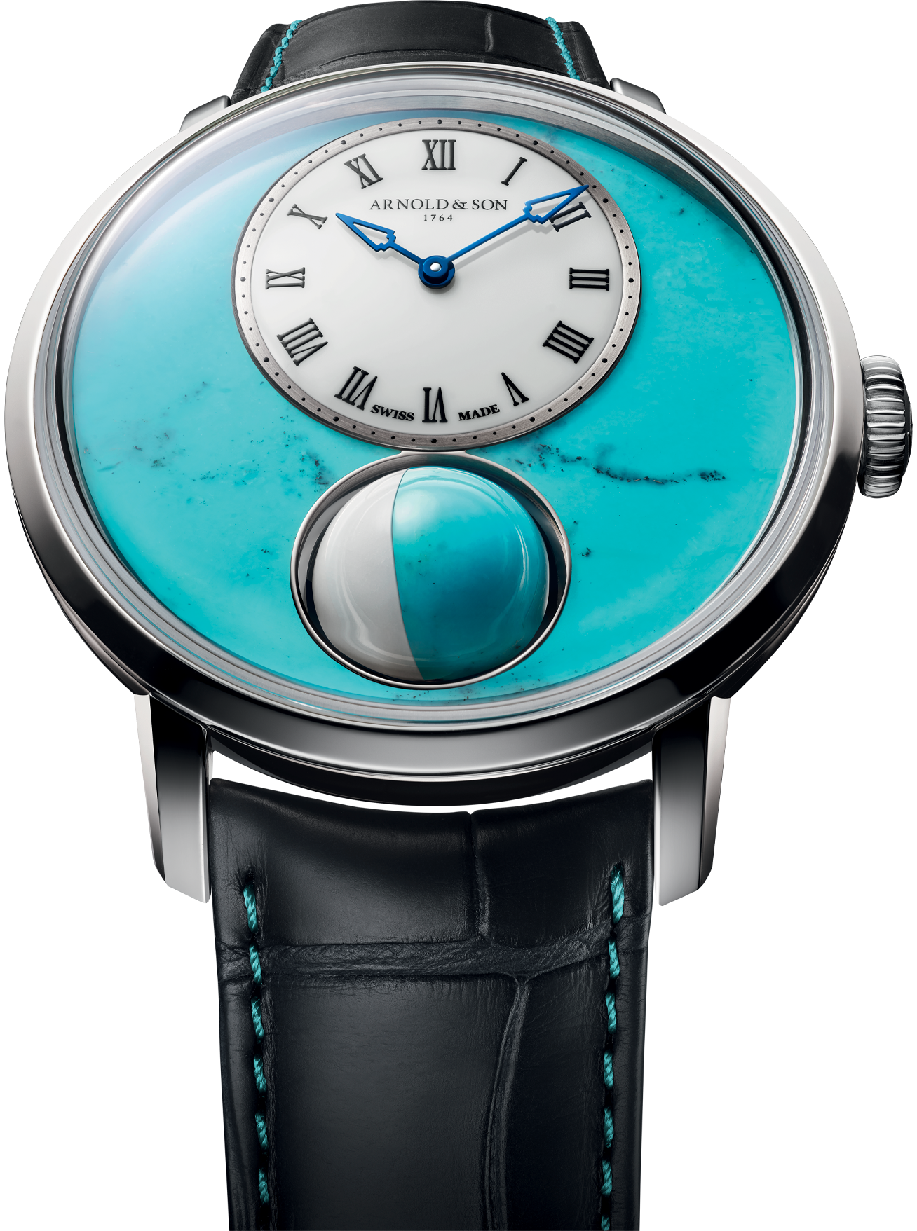 The Luna Magna Steel Turquoise, created exclusively for the Americas (the United States, Canada and Mexico), takes its inspiration from the symbolic richness of the region’s turquoise. This ancestral stone was venerated by many indigenous civilisations for its protective qualities, its ability to act as a bridge between the heavens and the Earth, and its healing powers. By choosing turquoise as the essence of this edition, Arnold & Son pays tribute to the cultural heritage and natural beauty of the America.