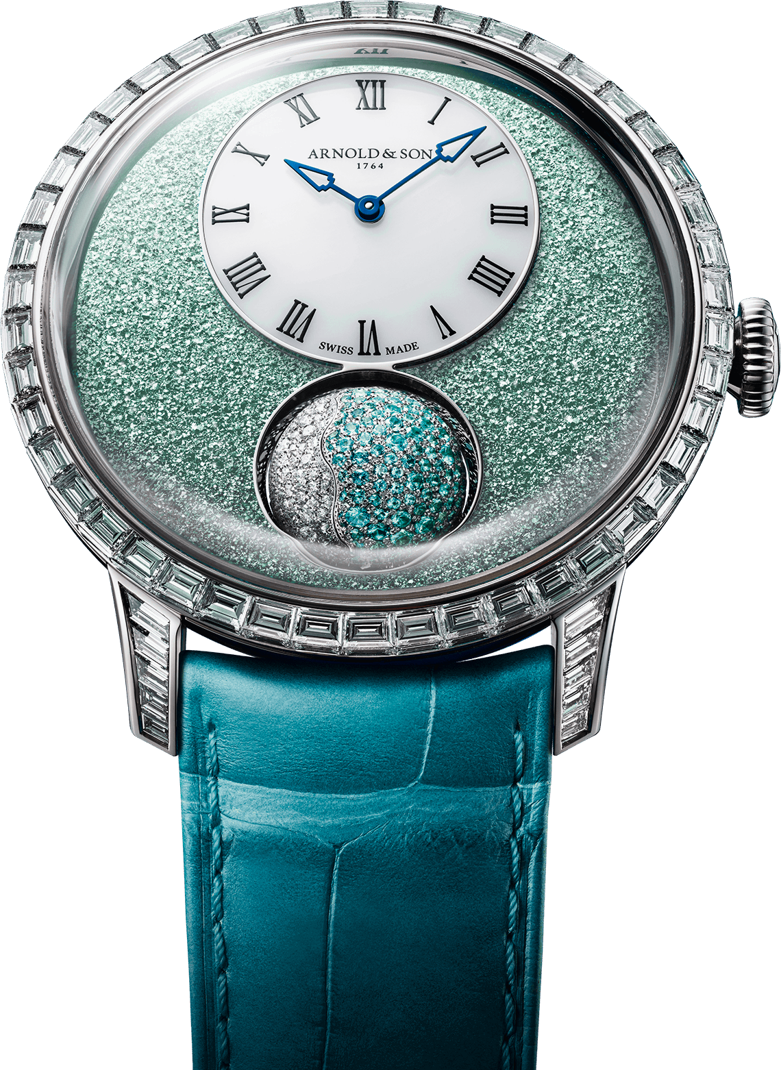 A traditional dial is located at 12 o’clock, marked with 12 signature Arnold & Son Roman numerals. This off-centre subdial owes its pristine, slight milky white hue to opal. Its classic design harks back to the aesthetics of the famous marine chronometers made by English watchmaker John Arnold. Under the time display, Luna Magna’s three-dimensional moon takes on a new appearance. The white gold globe is entirely pavé-set. It is split into 161 brilliant-cut diamonds, representing the illuminated side of the moon, and the same number of Paraíba tourmalines for the portion in shadow.