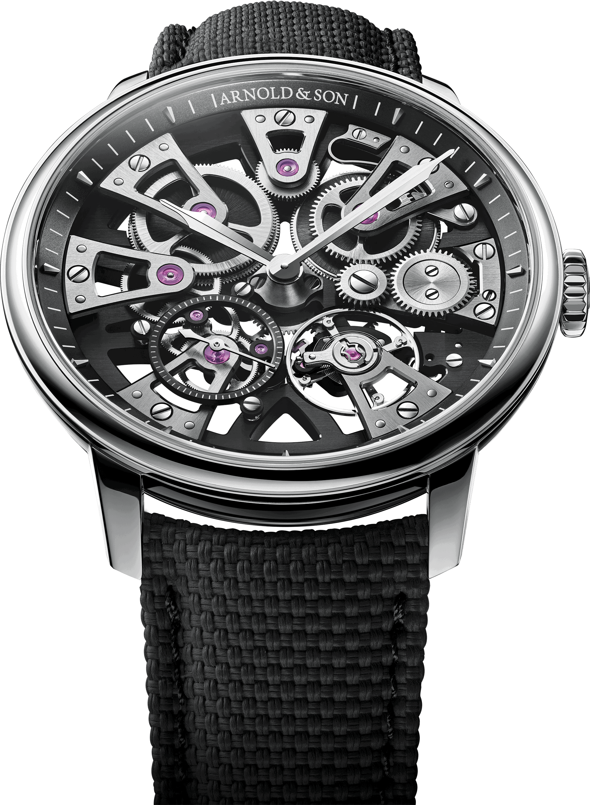 With its two large barrels arranged in series, Nebula 40 Steel offers a power reserve of 90 hours: exceptionally long for a skeletonised piece, but typical of Arnold & Son calibres. Their energy is transmitted to the gear train, whose layout follows the star-shaped arrangement of the bridges. The balance at the end oscillates at a frequency of 3 hertz. These attributes combine to make the A&S5201 calibre a rare phenomenon in the watchmaking cosmos.