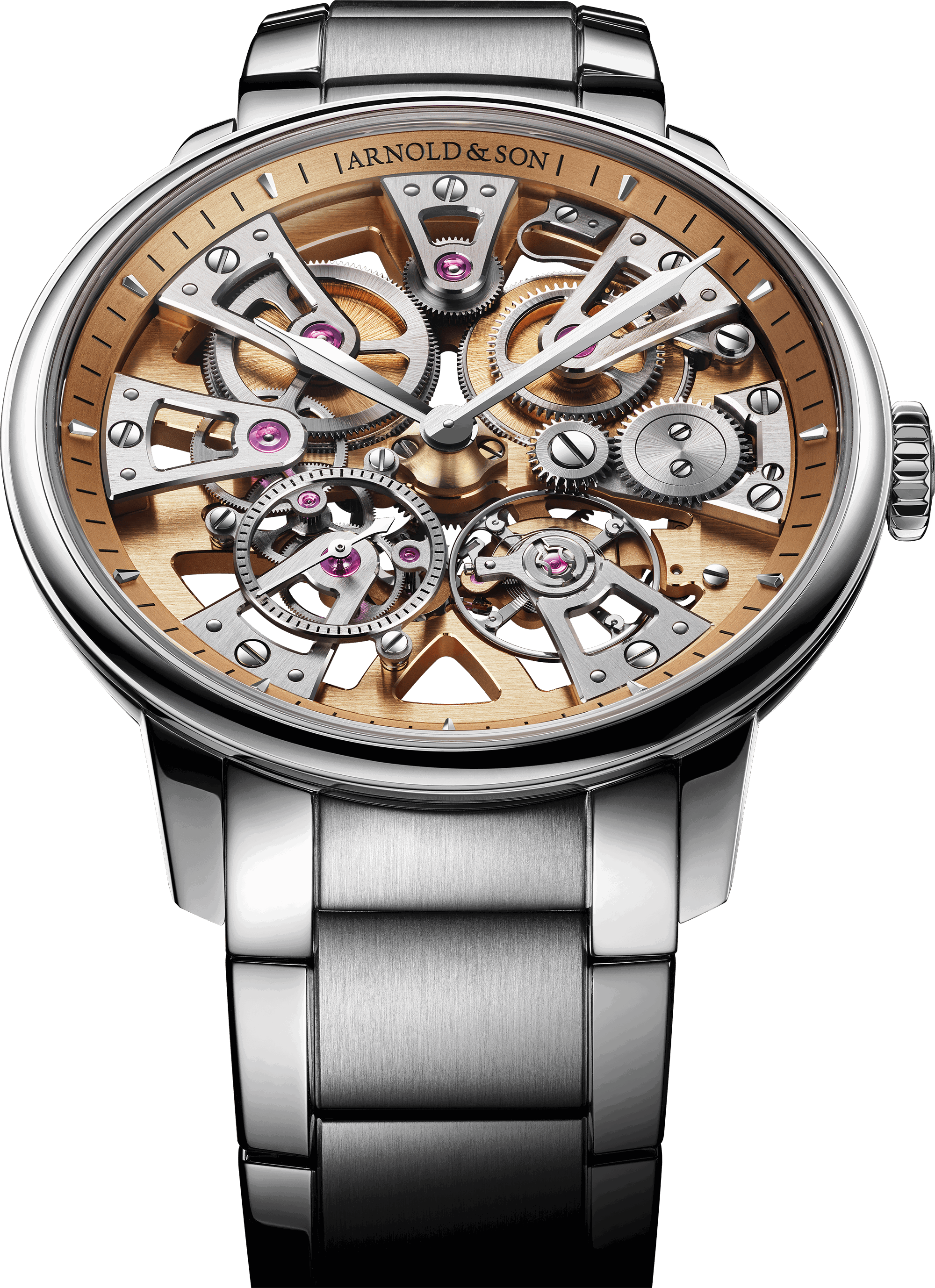 The new generation of Arnold & Son cases focuses on the purity of lines and curves. Softened flanks and plunging lugs strip back the aesthetics of Nebula 40 Steel to the essential: its signature movement, the central star around which the aesthetics of the collection revolve.