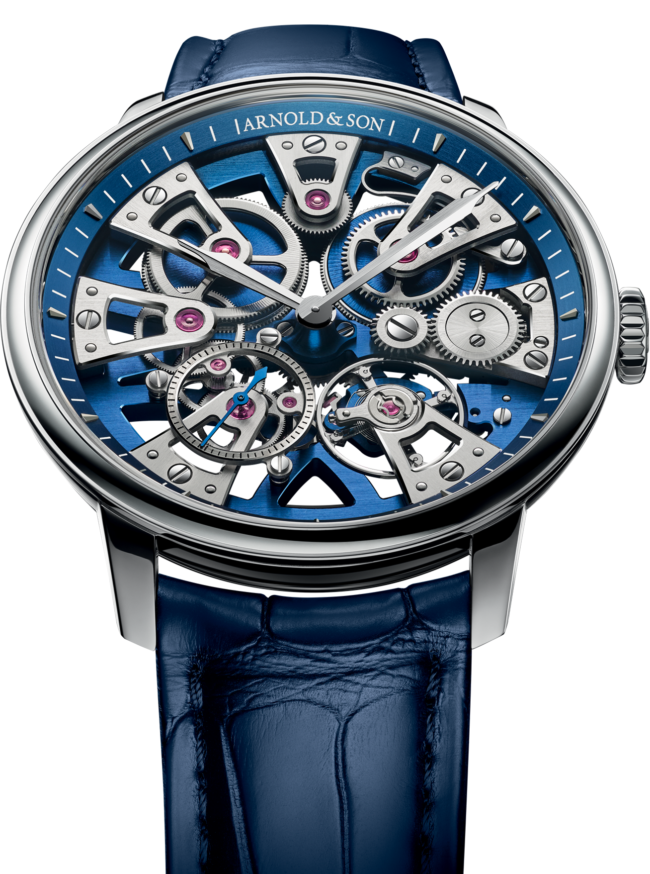 In contrast, the bridges, ratchets, cogs and even the balance have a palladium finish to echo the colour of the steel case. A blue strap in alligator leather or rubber completes the timepiece. Arnold & Son is also presenting a version with a three-link steel bracelet, whose understated design allows the balanced arrangement of the case and movement to truly shine.