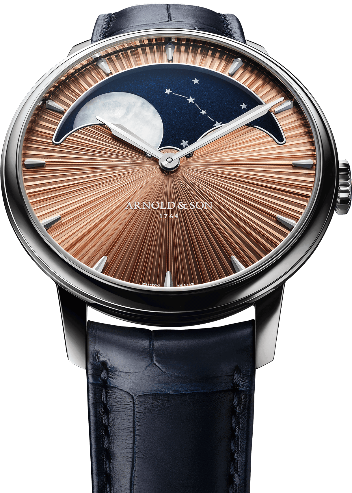 The constellations have been chosen as a direct reference to John Arnold’s history as a maker of naval chronometers. The Big Dipper and Cassiopeia have been used by navigators in the northern hemisphere since time immemorial to find their bearings and locate the North Star (Polaris). The position of the latter defines the North and its angular altitude, or position in the North-South plane, and allows the distance to the equator, i.e., latitude, to be estimated.