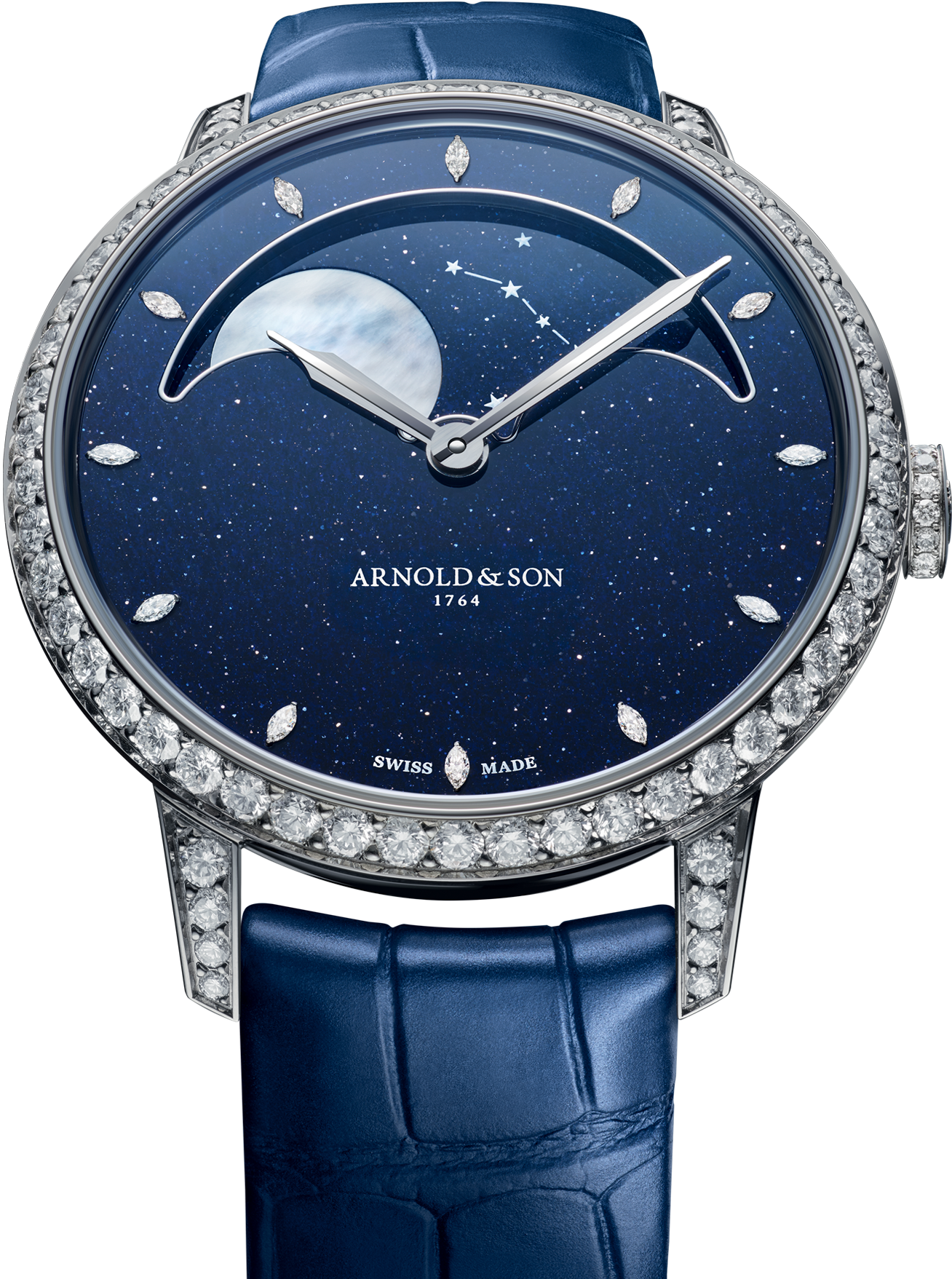 In keeping with the tradition of the collection, the moon is framed by the constellations of Ursa Major and Cassiopeia, which are also hand-painted and enhanced with luminescent material. This choice is a nod to the history of John Arnold, who pioneered marine timekeeping. These two constellations have guided sailors since time immemorial. Halfway between them is Polaris, the Pole Star. Its fixed position invariably points north and its altitude can be used to calculate latitude. Prior to the invention of instruments that measure longitude, it was the only reliable landmark at sea.