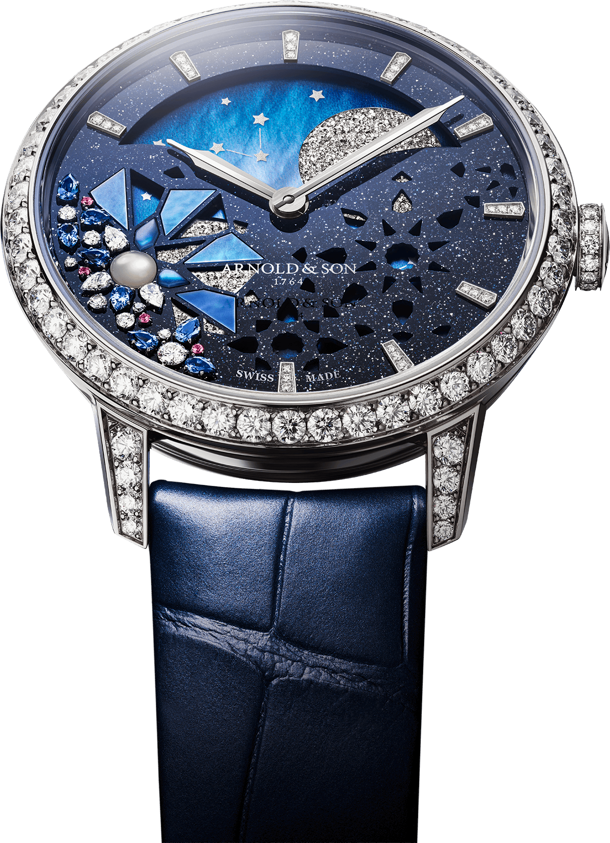 Arnold & Son designed, created, embellished and powered this timepiece for women. A 38 mm case houses a calibre designed for this moon-phase complication. It extends into a blue alligator-leather strap with a satin finish and fuchsia lining.