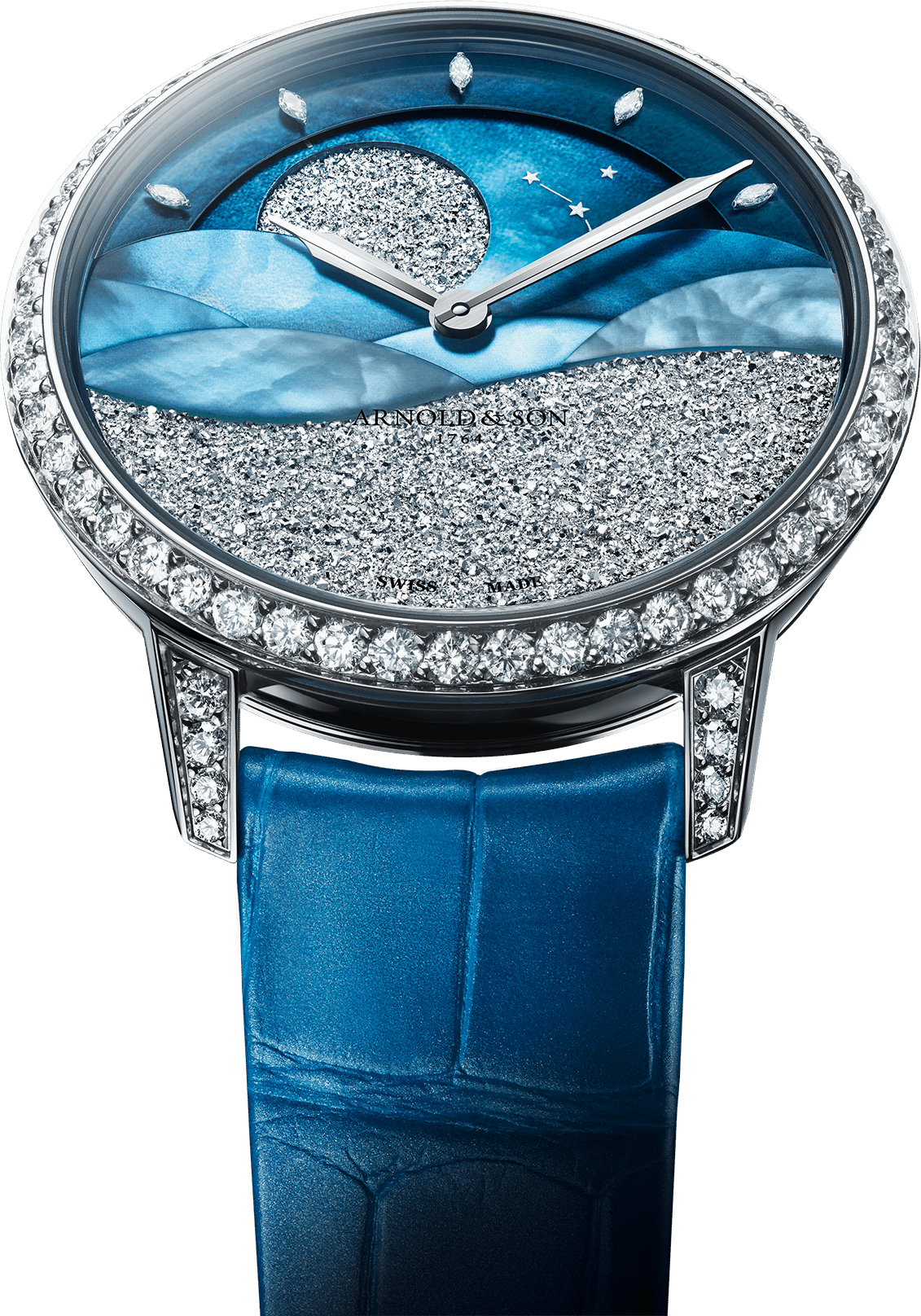 Behind a wave of ruthenium crystals, a maze of blue, mint-green and turquoise hills emerge one after the other before receding towards the horizon. The sky above this scene, scattered with hand-painted stars, is filled with an immense moon. Its surface, also made from ruthenium crystals, illuminates the sky. The use of this rare material has become a special signature of Arnold & Son, adding preciousness, light and texture. Five marquise-cut diamonds indicating the hours provide the finishing touch on this work of art.