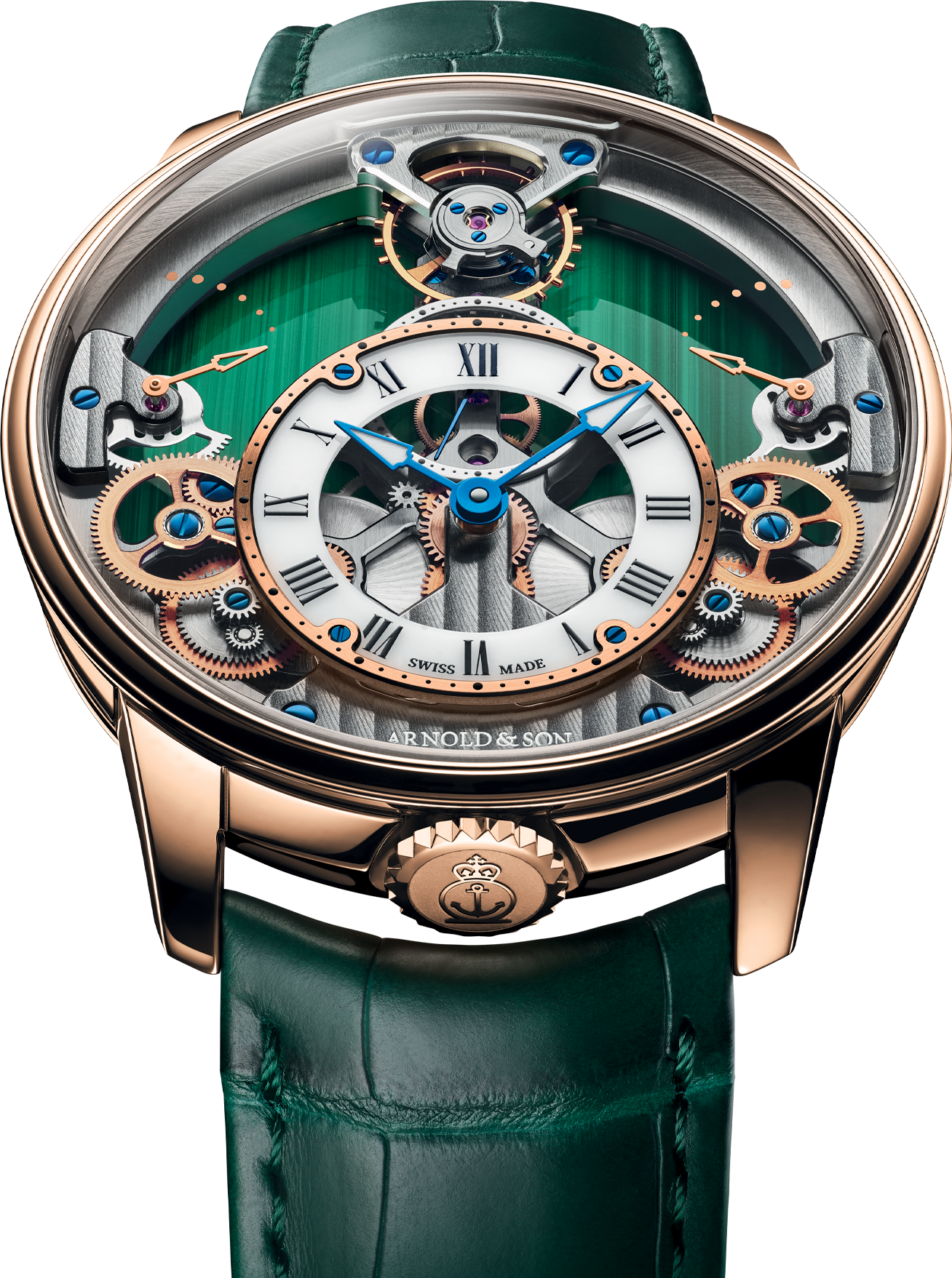 For the Time Pyramid, Arnold & Son has opted for the warmth of 18-carat red gold or the understated elegance of platinum for its case, which measures 42.5 mm in diameter. These precious metals elevate the deep and intense green of the malachite, while magnifying the complexity of the movement through contrast. In order to provide as much space as possible for the mechanism, the House has chosen a thin bezel to secure the slightly domed sapphire crystal. It offers a direct view of the extensively openworked main plate of the A&S1615 hand-wound mechanical movement. The latter holds the various components of the calibre, such as the balance wheel positioned at 12 o’clock and the two power-reserve indicators. So as to preserve the linearity and symmetry of the mechanical structure that contribute to making the Time Pyramid unique, the watchmakers have ingeniously placed the winding crown between the lugs, at 6 o’clock.